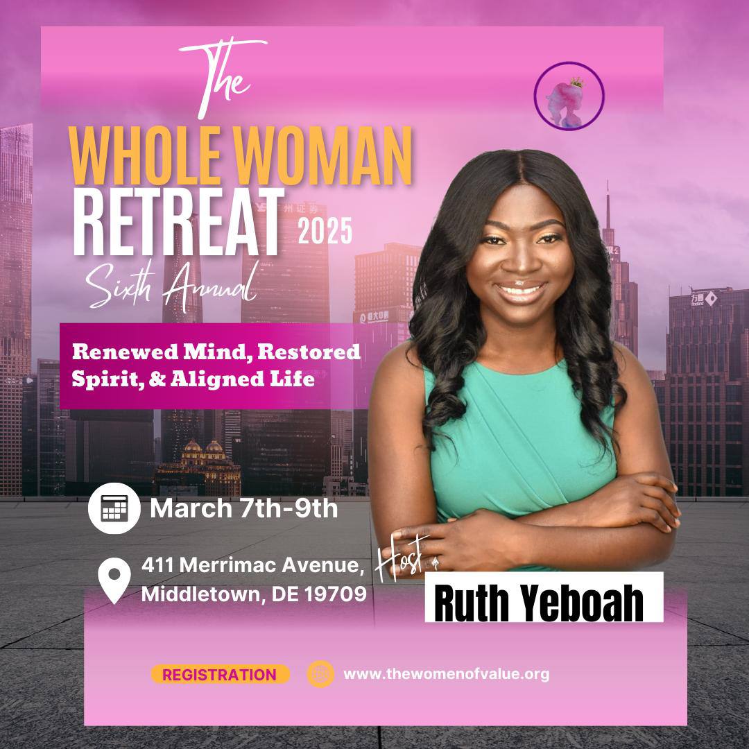 411 Merrimac Avenue, Middletown, DE 19709Join us for the 6th Annual Whole Woman Retreat, hosted by Ruth Yeboah. This transformative 3-day event is designed to help women experience a renewed mind, a restored spirit, and an aligned life. Don’t miss this powerful opportunity for growth, healing, and empowerment.